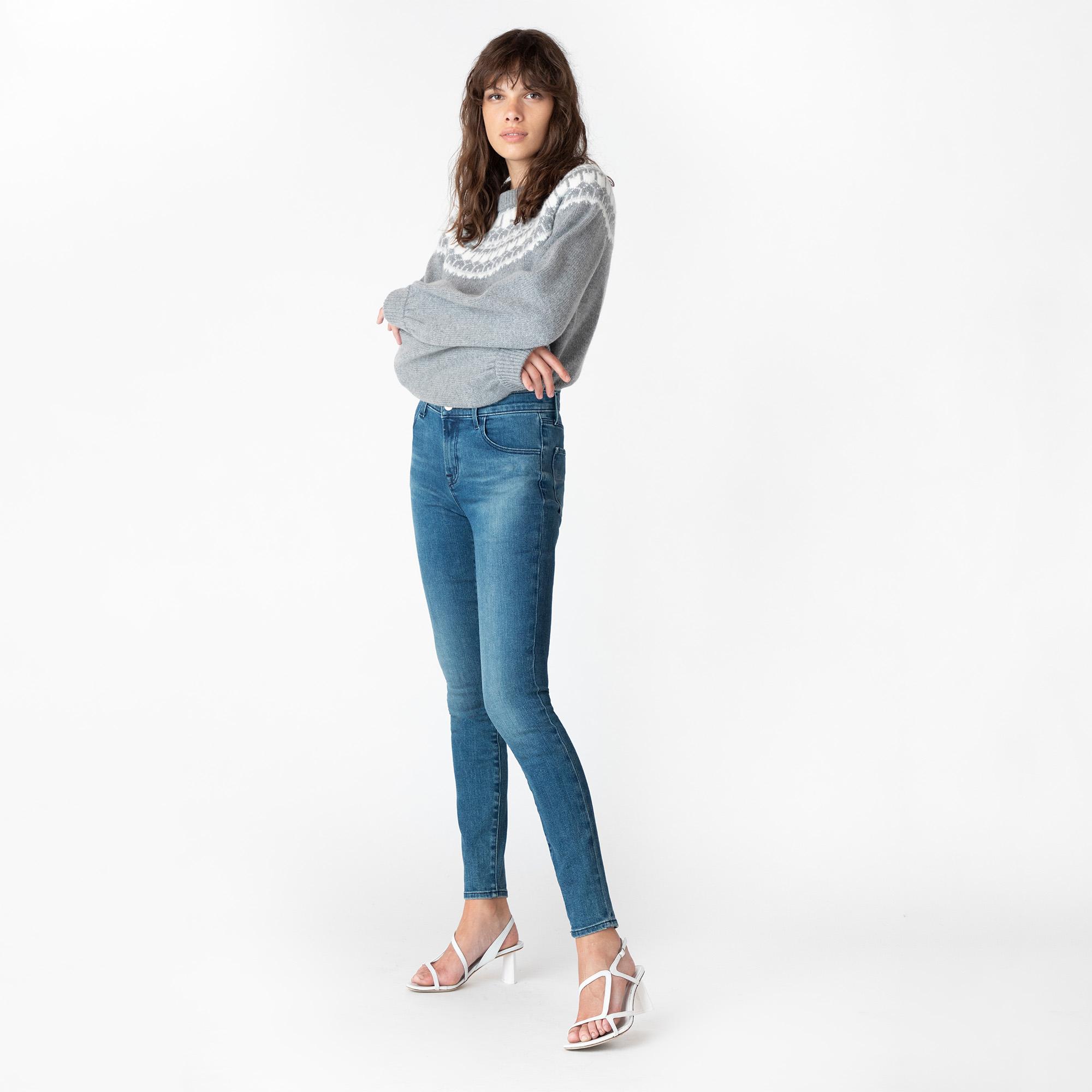 하이 라이즈 슈퍼 스키니 진으로 j 브랜드의 헤리티지 블루 블렌드 데님과 신축성.